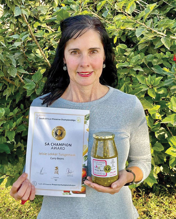 AGRI-PULSE – BRITS – Van piekels tot pesto en blatjang tot konfyt, het Lizelle Elliott van Geluk net buite Brits, gewys sy is ‘n preserveerkoningin toe sy as wenner van die Suid-Afrikaanse Preserveerkampioenskappe in die afdeling vir kerrieboontjies gekroon is.